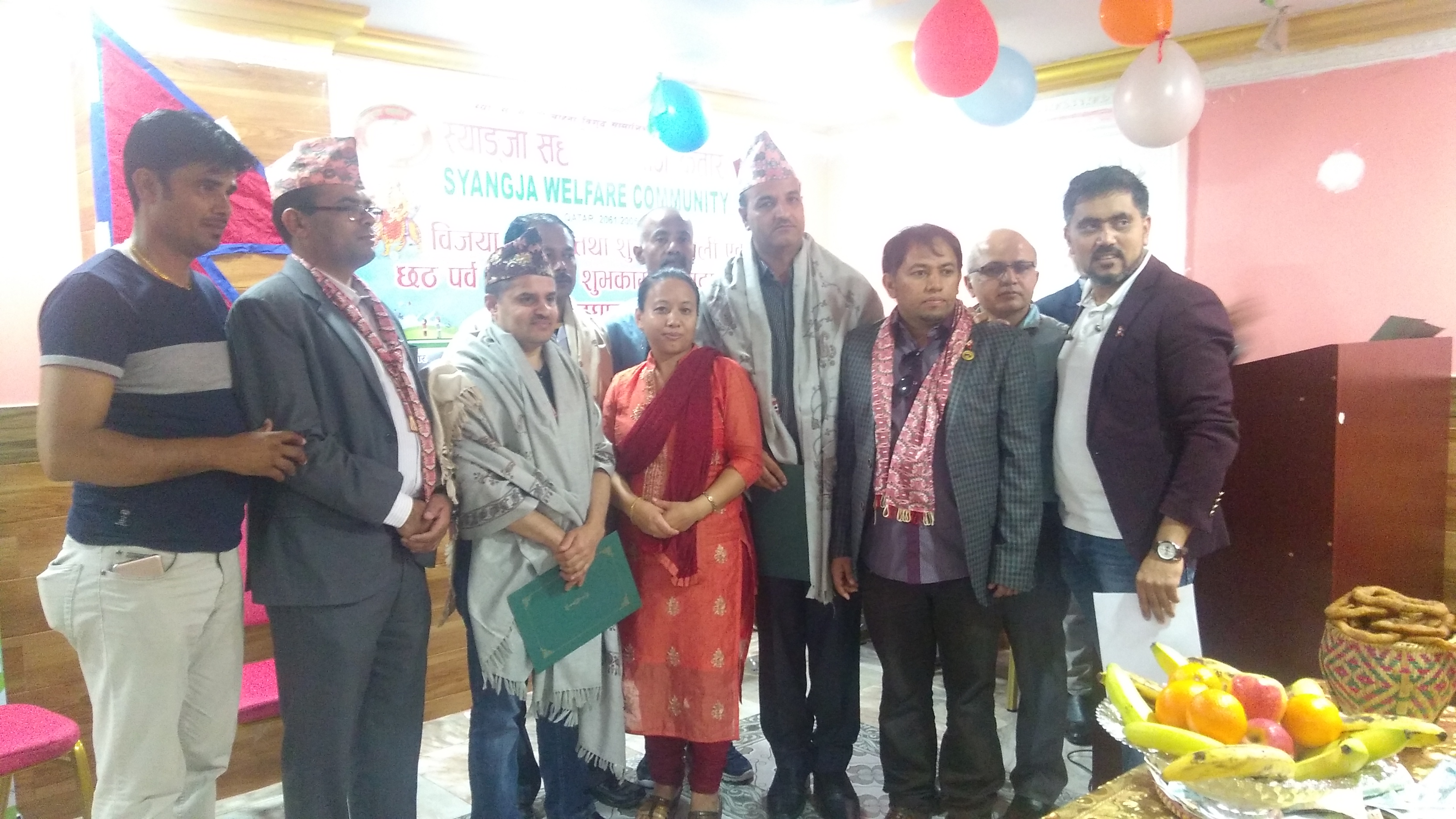 कार्यक्रममा सस्थालाई विभिन्न समयमा सहयोग गर्ने समाजका सल्लाहकार भेषराज पराजुली ,चिरञ्जिवि ढकाल, याम प्रसाद श्रेष्ठ साथै स्याङ्जालि कलाकार बबिता माझिलाई दोसल्ला र सम्मान पत्रका साथ सम्मान गरिएको थियो ।