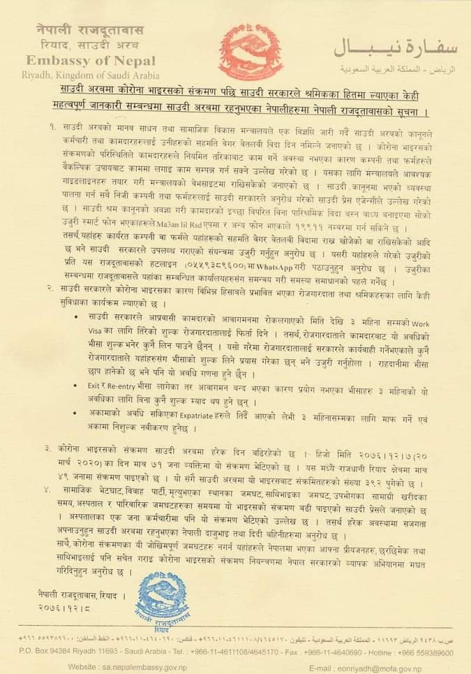 १. साउदी अरबको मानव साधन तथा सामाजिक विकास मन्त्रालयले एक विज्ञप्ति जारी गर्दै साउदी अरबको कानूनले कर्मचारी तथा कामदारहरुलाई उनीहरुको सहमति वेगर वेतलवी विदा दिन नमिल्ने जनाएको छ । कोरोना भाइरसको संक्रमणको परिस्थितिले कामदारहरुले नियमित तरिकाबाट काम गर्ने अवस्था नभएका कारण कम्पनी तथा फर्महरुले वैकल्पिक उपायबाट काममा लगाइ काम सम्पन्न गर्न सक्ने उल्लेख गरेको छ । यसका लागि मन्त्रालयले आवश्यक गाइडलाइनहरु तयार गरी मन्त्रालयको वेभसाइटमा राखिसकेको जनाएको छ । साउदी कानूनमा भएको व्यवस्था पालना गर्न सबै निजी कम्पनी तथा फर्महरुलाई साउदी सरकारले अनुरोध गरेको साउदी प्रेस एजेन्सीले उल्लेख गरेको छ । साउदी श्रम कानूनको अवज्ञा गरी कामदारको इच्छा विपरित विना पारिश्रमिक विदा बस्न वाध्य बनाइएमा सोको उजुरी स्मार्ट फोन भएकाहरूले Ma3an lil Rsd एपमा र अन्य फोन भएकाले १९९११ नम्वरमा गर्न सकिने छ ।