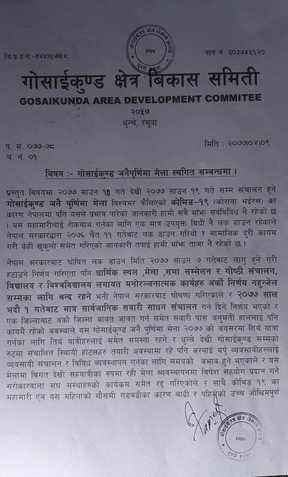 प्राकृतिक बिपद, धुन्चे देखि गोसाइँकुण्ड सम्मका स्थायी होटलहरु पुर्ण ब्यबस्थित नहुनु,अस्थायी थर्पु व्यबसायिहरु संचालन र ब्यबस्थापन गर्न समयको आभाव हुनु,बाढी पहिरोको कारण तिर्थ यात्रीहरुलाई उच्च जोखिमपुर्ण यात्रा हुनुका साथै यो जिल्लालाई कोरोनामुक्त जिल्ला पुन: स्थापन गराउनुका लागि गोसाइँकुण्डमा हुने सम्पुर्ण कार्यहरु बन्द गरिएको कुरा गोसाइँकुण्ड क्षेत्र बिकास समितिका अध्यक्ष संजीव डि एम द्वारा हस्ताक्षरित पत्रमा उल्लेख गरिएको छ।