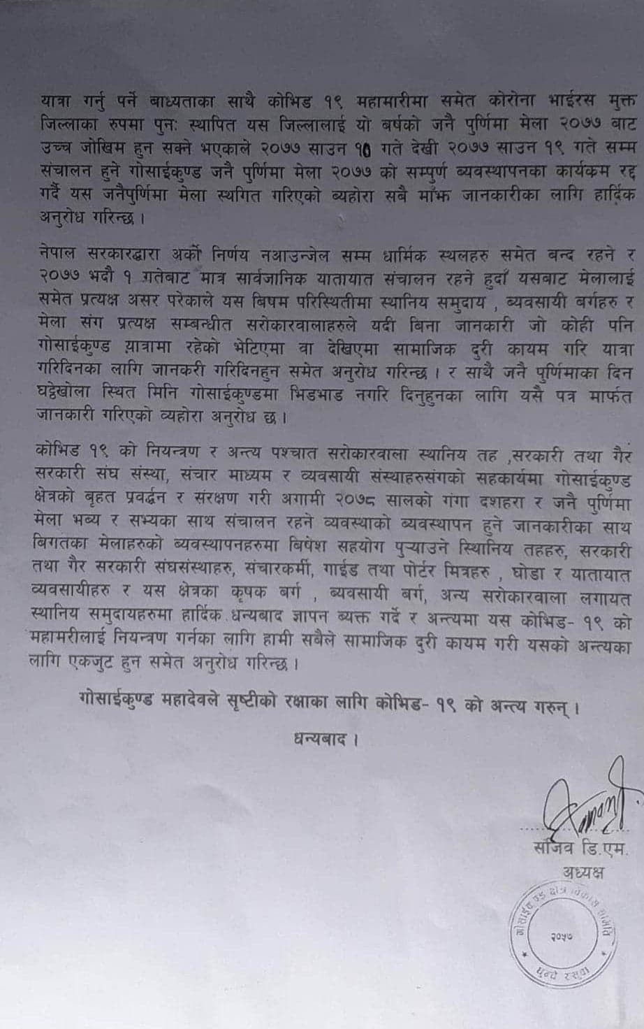 कोभीड-१९ को नियन्त्रण अन्त्य पश्चात् सरोकारवाला स्थानिय तह,सरकारी तथा गैर संघ सस्थाहरु,संचार माध्याम,ब्यबसायी सस्थाहरुको सहकार्यमा गोसाइँकुण्ड धार्मिक तथा पर्यटन क्षेत्रको बृहत् प्रबर्द्धन संरक्षण गरि आगामी २०७८ को गङ्गा दशहरा र जनै पुर्णिमा मेला भब्य रुपमा संचालन गरिने जानकारी गराउदै पछिल्ला बर्षहरुमा ब्यबस्थापन लगाएत विभिन्न समयमा सहयोग पुर्याउने ज्ञात अज्ञात संघ सस्था बुद्धिजिबी व्यापारी लगाएत सम्पुर्णमा धन्यबाद ब्यक्त गरेका छन भने कोभिड १९ को नियन्त्रणको लागि सबैले सरकारले तोकेको मापदण्ड प्रयोग गरि अगाडि बढ्न समेत आग्रह गरिएको छ।