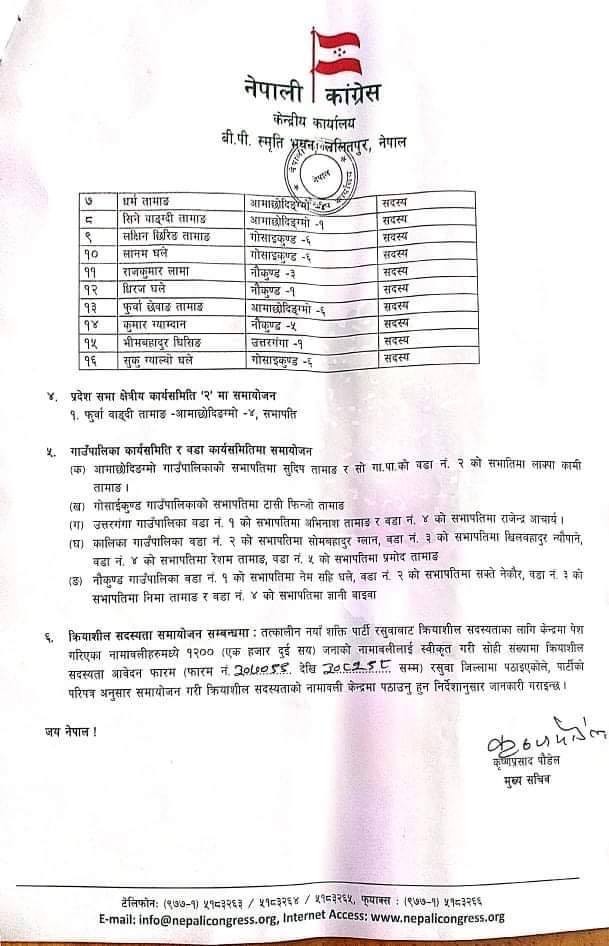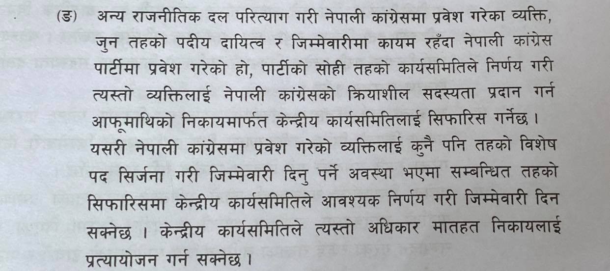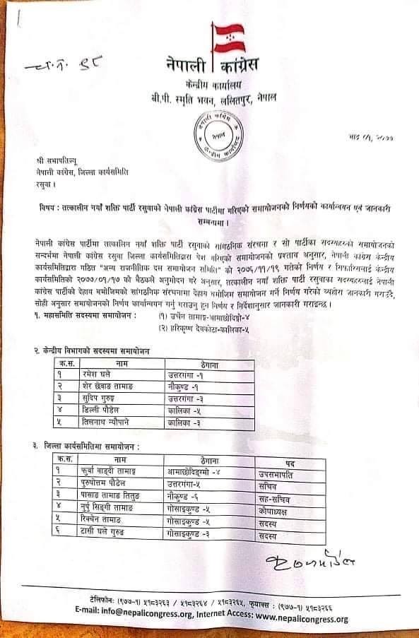 नेपाली कांग्रेसको बिधानको धारा ४ उपधारा १०(ङ) ले अन्य पार्टीबाट प्रवेश भएका सदस्यहरूलाई दिने क्रियाशील र सो समितिमा हैसियत अनुसार दिने पद तथा ज़िम्मेवारी सम्बन्धित कार्य समितिको सिफारिसमा मात्र केन्द्रीय कार्य समितिले पद तथा ज़िम्मेवारी दिन सक्ने वैधानिक प्रावधान रहेता पनि रसुवा कांग्रेसमा केन्द्रको पत्रले महासमिति सदस्य २ , उपसभापति लगायत ज़िल्ला कार्य समितिमा १६ जनाको नाम नै किटान गरी पठाएको नेपाली कांग्रेस ज़िल्ला कार्य समितिले कहिले सिफ़ारिश नगरेको पाईएको छ। प्रदेश कार्य समितिको सभापतिमा मनोनयन गरी पठाएको सदस्यलाई सम्बन्धित प्रदेश कार्य समितिले कहिले सिफारिस नगरेको र यसै गरी गोसाईंकुण्ड गाउँपालिका सभापति र आमाछोदिंमो गाउँपालिकाको सभापतिमा सोही समितिले प्रस्ताव गर्नु पर्ने वैधानिक प्रावधान अनुसार प्रस्ताव नगरेको देखिएको छ।त्यसैगरी वडा सभापतिहरुमा ११ जना नियुक्ति गरी पठाएको पत्र नेपाली कांग्रेसको बिधान विपरीत रहेको छ।