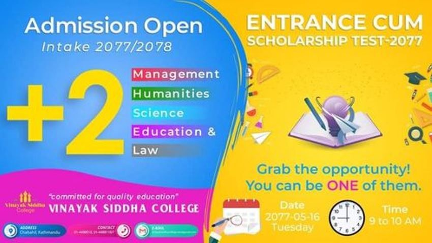 विनायक सिद्ध कलेजले यहि आउदो भाद्र १६ गते ९ बजे देखि १० बजे सम्म अनलाईन प्रवेश परीक्षा संचालन गर्ने भएको छ । कलेजले आफ्नो अफिसियल पेज मार्फत जानकारी गराईसकेको छ ।परिक्षाको किसिम अब्जेक्टिभ ५० वटा प्रश्न सोधिनेछ जुन विद्यार्थीको इच्छा अनुसार ईमेल,म्यासेन्जर,वाट्साप लगाएतबाट पठाईनेछ भने बिद्यार्थीले एक घन्टाभित्र हल गरि पठाउनु पर्ने छ।कलेजले Entrance cum scholarship test -2077 अन्तर्गत ५० जना बिद्यार्थीलाई छात्रवृत्ति दिने घोषणा गरेको छ।जस अन्तर्गत टप १० पर्न सफल बिद्यार्थीलाई सत प्रतिसत,११-२५ औ स्थान सम्म पर्न सफल विद्यार्थीहरुलाई ७५% र २६-५०औ स्थान सम्म पर्न सफल बिद्यार्थीहरुका ६०% छात्रवृत्ति दिने कलेजले जानकारी गराएको छ।
