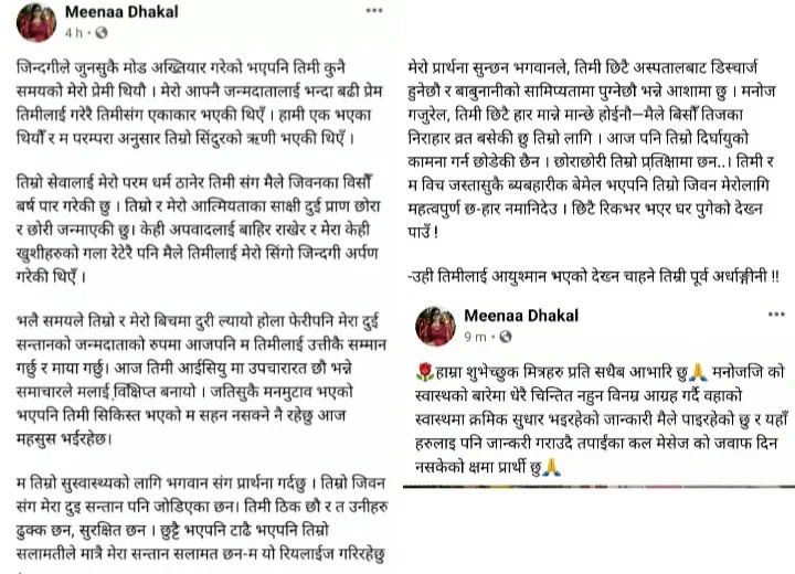 गजुरेलकि पुर्ब धर्मपत्नी मिना ढकालले लेखेका मन छुने स्टाटसहरु जस्ताको तस्तै: