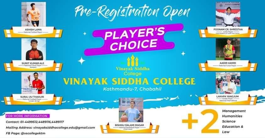 विशेष गरि नेसनल प्लेयरः आशिस लामा, सुरज ज्यु ठकुरी, आदिल हमिद, सुमित आले लगाएत धेरै फूटबल प्लेयरहरु साथै १३ औँ एसियन गेम का गोल्ड मेडलिष्ट पुनम श्रेष्ठको रोजाइ पनि विनायक सिद्ध कलेज नै परेको छ । साथै नेपालमा सानै उमेरमा एन्फा रेफ्री हुनु भएका हरिश कार्की, सपन बस्नेत संगै रोबिन बुढाथोकी तथा कन्चन तिमिल्सिनाको रोजाई पनि विनायक सिद्ध कलेज नै बन्यो । गुणस्तरीय शिक्षालाई अर्जुन दृष्टि बनाएको कलेजले दक्ष जन शक्ति उत्पादन गरी देशको समग्र विकासमा योगदान गर्ने गरी विभिन्न शैक्षिक कार्यक्रमहरु संचालन गरिरहेको छ ।