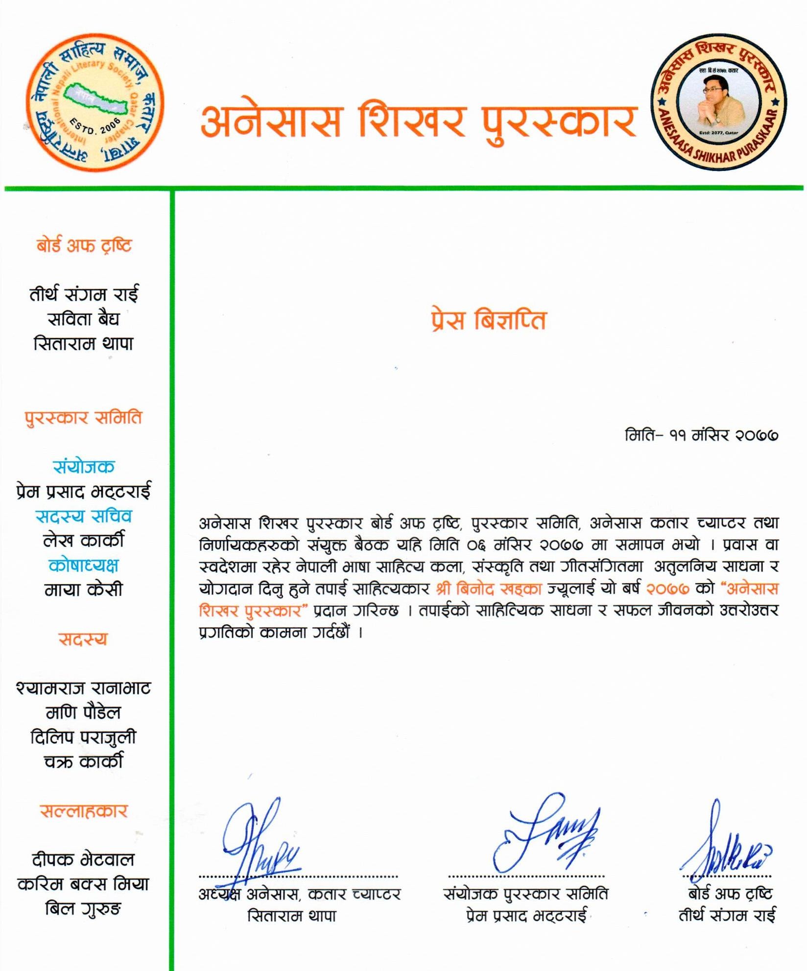 यो बर्षको “अनेसास शिखर पुरस्कार—२०७७” साहित्यकार बिनोद खड्कालाई पुरस्कृत गर्ने निर्णय गरेका छन । तीन दशकदेखिको निरन्तर लेखनमा संलग्न रहनु भएका खड्का सन २००५ मा कतार प्रवेश पछि निरन्तर प्रवासी बिसयबस्तुमा केन्द्रित रहेर लेखिरहनु भएको छ । कतारमा हुने हरेक साहित्यिक गतिबिधिमा क्रियाशिल रहनुको साथै अनेसास र नवोदितमा पनि आवद्ध हुनुहुन्छ । बिगत १५ बर्षदेखि कतारमा कार्यरत साहित्यकार बिनोद खड्काको साहित्यिक साधना र योगदान यो पुरस्कारको लागि उपयुक्त हुनेछ भन्ने हाम्रो मान्यता रहेको छ । हामी वहाँको आगामी साहित्यिक साधना र सफल जीवनको कामना सहित बधाई साथै शुभ कामना गर्दछौं ।