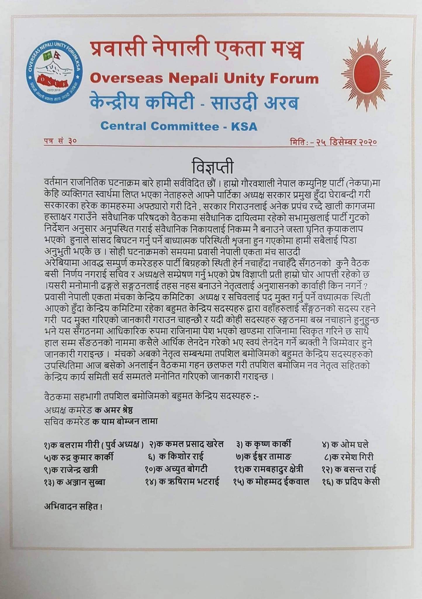 सो घट्नाक्रमको समयमा प्रवासी नेपाली एकता मंच साउदी अरबमा अावद्ध सम्पूर्ण पार्टी बिग्रहको स्थिति नचाँहादा नचाँहादै संगठनको कुनै पनि बैठक बसेर निर्णय नगराई सचिव र अध्यक्षले सम्प्रेषण गरेको प्रेस विज्ञप्तिप्रति केन्द्रीय सदस्यहरूले घोर अापति जनाएका छन् ।