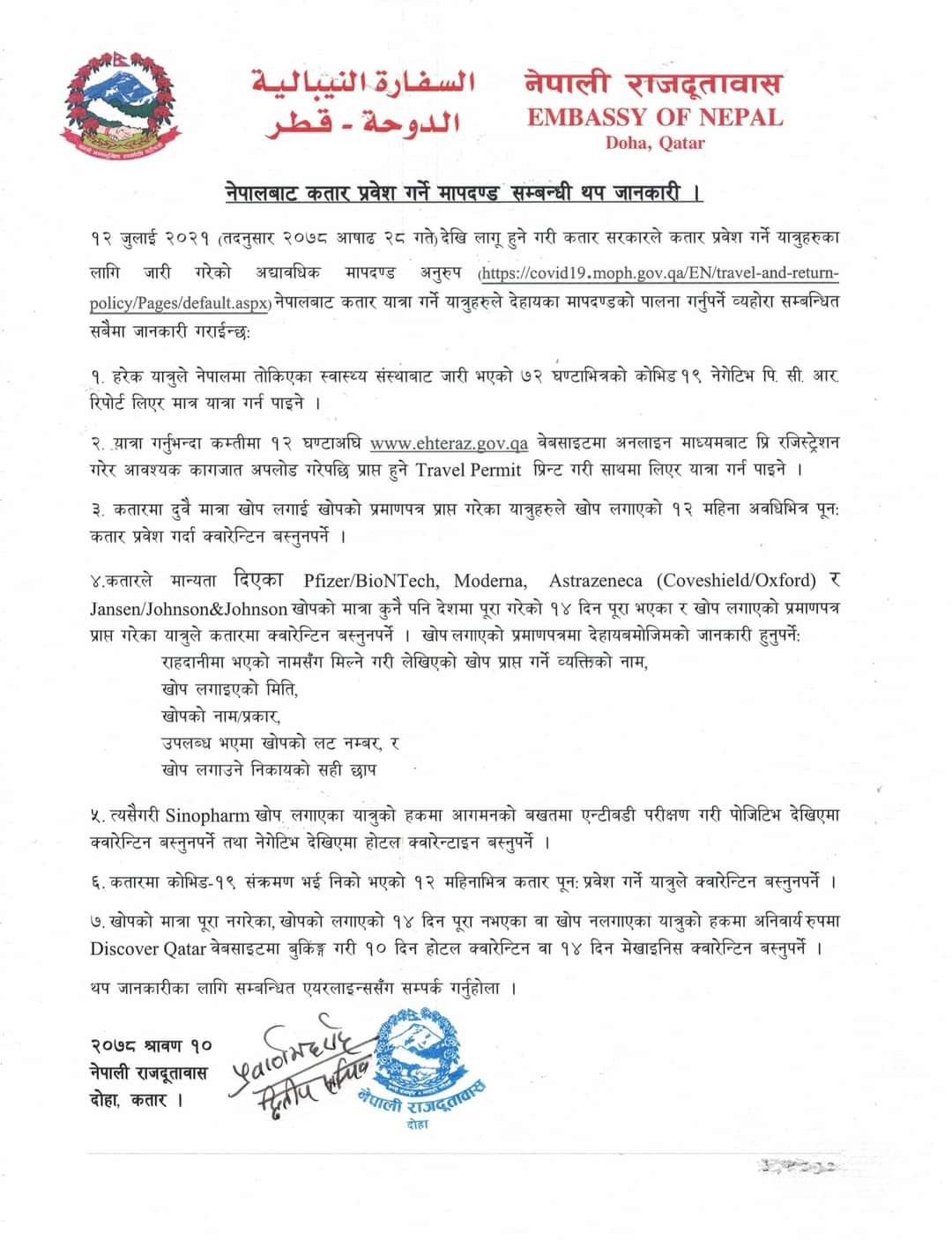 आइतबार आफ्नै फेसबुक पेज मार्फत नेपालबाट कतार प्रवेश गर्ने यात्रुहरुका लागि कतार सरकारले जारी गरेको अद्यावधिक मापदण्डबारे जानकारी दिएको हो ।