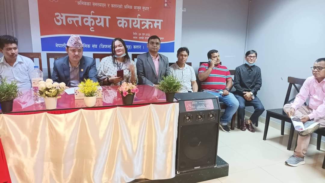 गैर आवासीय नेपाली संघ राष्ट्रिय समन्वय परिषद कतार का श्रमिक बिभाग प्रमुख प्रेम चलाउनेले नेपाली श्रमिकका समस्या समाधान गर्नको लागि आफ्नो बिभाग बाट चालेका प्रयास हरु बारेमा बताएका थिए । कतारको कानुनको सुधार बारेमा आई .टि. यु. सि प्रतिनिधि बिश्वराज नेपाल र प्रवासी नेपाली समन्वय समिति कतार प्रतिनिधि हमिद मुसलमान ले जानकारी गराए ।