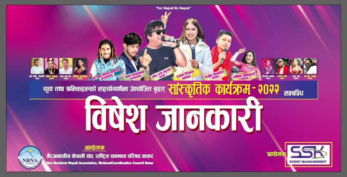 कतारमा रहेका यूवा तथा श्रमिकहरूको सह्योगार्थ आयोजित उक्त कार्यक्रम एसएसके ईभेन्ट म्यानेजमेन्टको प्रायोजनमा गर्न लागिएको कार्यक्रमका मिडिया संयोजक दिपजंग शाह ठकुरीले जानकारी दिएका छन ।