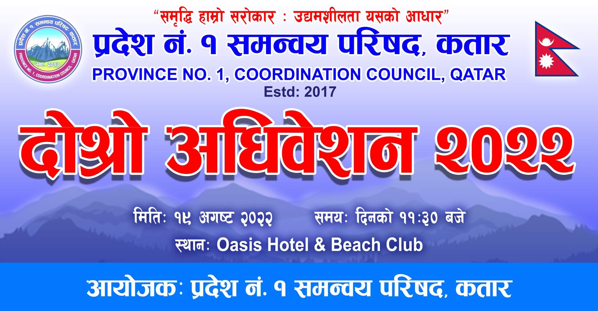 दोहा - प्रदेश नं १ समन्वय परिषद् कतारको दोस्रो अधिबेशन हुने भएको छ ।