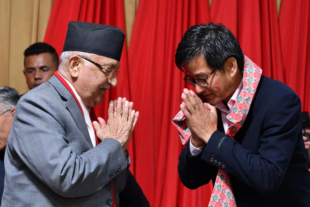 अध्यक्ष ओलीले नवनिर्वाचित अध्यक्ष सञ्जय थापा, निवर्तमान अध्यक्ष भक्त गुरुङसहितका निवर्तमान तथा नयाँ कार्यसमितिका पदाधिकारी र सदस्यलाई खादा लगाएर बधाई दिनुभएको थियोे ।
