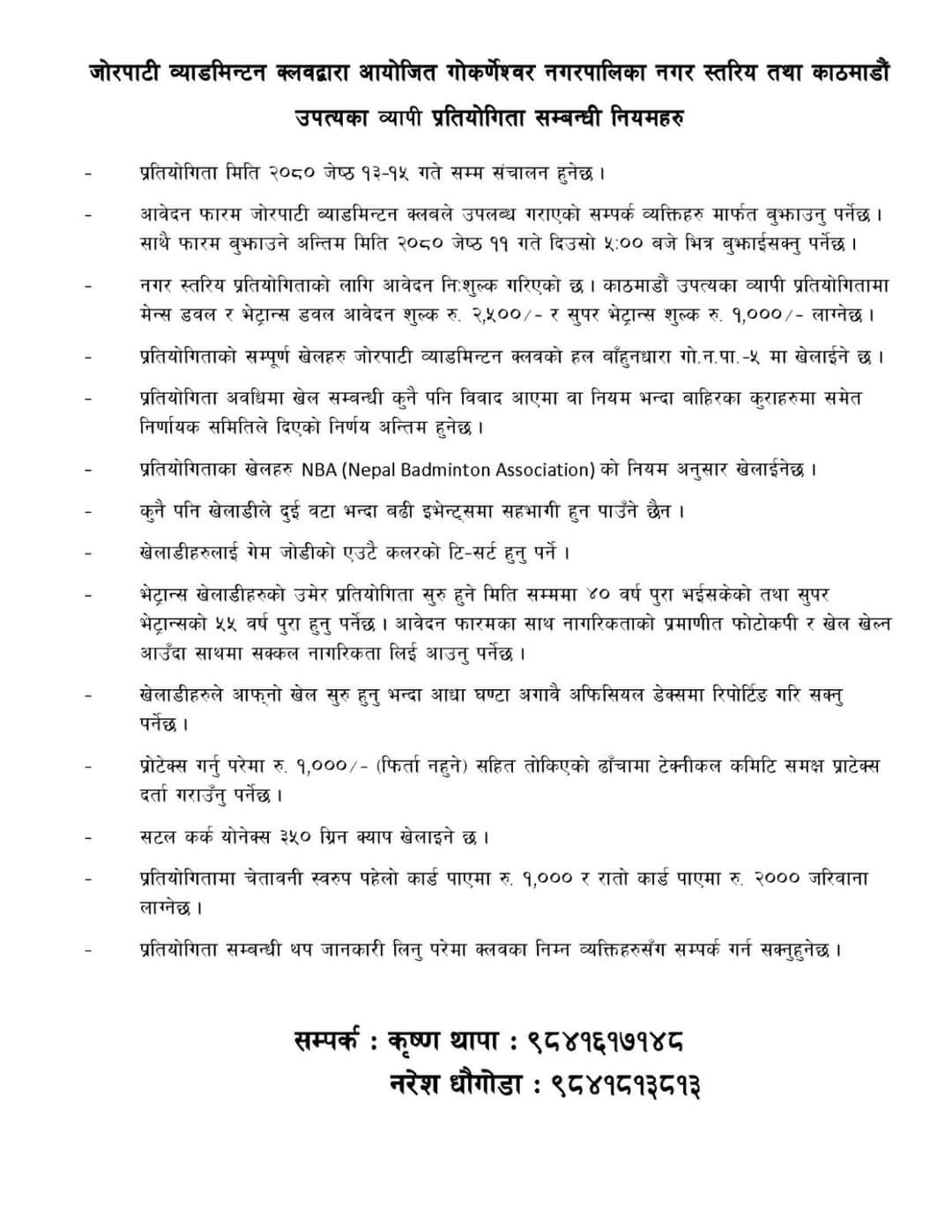 जोरपाटी ब्याडमिन्टन क्लब गोकर्णेश्वर नगरपालिका वडा नं ५ जोरपाटीको आयोजनामा हुने उक्त प्रतियोगिता यहि आउँदो जेठ १३,१४ र १५ गते जोरपाटी ब्याडमिन्टन क्लबको हलमा हुने भएको छ।उक्त प्रतियोगितामा सहभागिता जनाउनको लागि जेठ ४ गते देखि जेठ ११ गते बेलुका ५ बजे भित्र आवेदन फारम क्लबले उपलब्ध गराएको सम्पर्क व्यक्तिहरु मार्फत बुझाउनु पर्ने छ।नगर स्तरीय प्रतियोगिताको लागि निशुल्क साथै काठमाण्डौ उपत्यका ब्यापि प्रतियोगिताकाहरू मेन्स डबल र भेट्रास डबलका लागि रु.२५ सय र सुपर भेट्रासका लागि आवेदन फारम शुल्क १ हजार लाग्ने बताईएको छ।नगर स्तरीय प्रतियोगिता: अन्तर्गत खुल्ला डबल र भेट्रोन डबल (40 Over) साथै उपत्यका स्तरीय प्रतियोगिता अन्तर्गत खुल्ला डबल ( Except NBA Top 20 Ranking), भेट्रान डबल ( 40 ओभर) र सुपर भेट्रान डबल (55 ओभर) का खेल हुने आयोजकले बताएको छ।