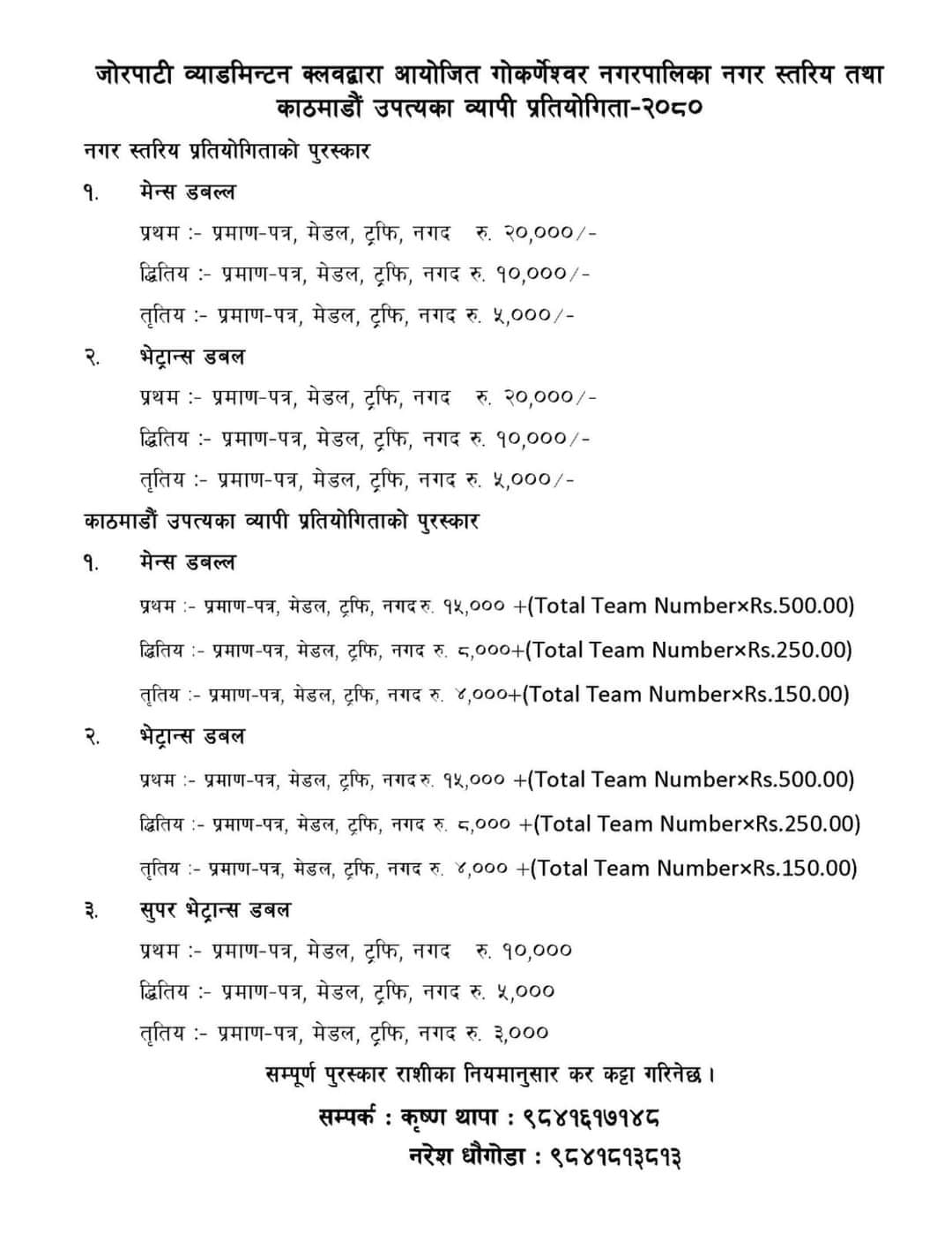 उपत्यकाब्यापी प्रतियोगिता: अन्तर्गत बिजेताहरुलाई मेन्स डबल खेलमा प्रथम पुरस्कार नगद रु. १५ हजार, प्रमाणपत्र, ट्रफी र मेडल, दोस्रो पुरस्कार नगद रु ८ हजार प्रमाणपत्र ,ट्रफी र मेडल,तेस्रो पुरस्कार नगद रु.४ हजार, प्रमाणपत्र ,ट्रफी र मेडल,भेन्ट्रास डबल: खेलका बिजेताहरुलाई प्रथम पुरस्कार नगद रु.१५ हजार,प्रमाणपत्र ,ट्रफी र मेडल,दोस्रो पुरस्कार नगद रु.८ हजार,प्रमाणपत्र ,ट्रफी र मेडल,तेस्रो पुरस्कार नगद रु.४ हजार,प्रमाणपत्र ,ट्रफी र मेडल प्रदान गरिने छ।साथै सुपर भेट्रास डबल: खेलमा भने प्रथम पुरस्कार नगद रु १० हजार,प्रमाणपत्र ,ट्रफी र मेडल,दोस्रो पुरस्कार नगद रु.५ हजार,प्रमाणपत्र ,ट्रफी र मेडल र तेस्रो पुरस्कार नगद रु.३ हजार,प्रमाणपत्र ,ट्रफी र मेडल प्रदान गरिने छ भने थप जानकारीको लागि कृष्ण थापा मोबाईल नं ९८४१६१७१४८ र नरेश धौगोडा मोबाईल नं ९८४१८१३८१३ मा सम्पर्क गर्न सकिने छ।