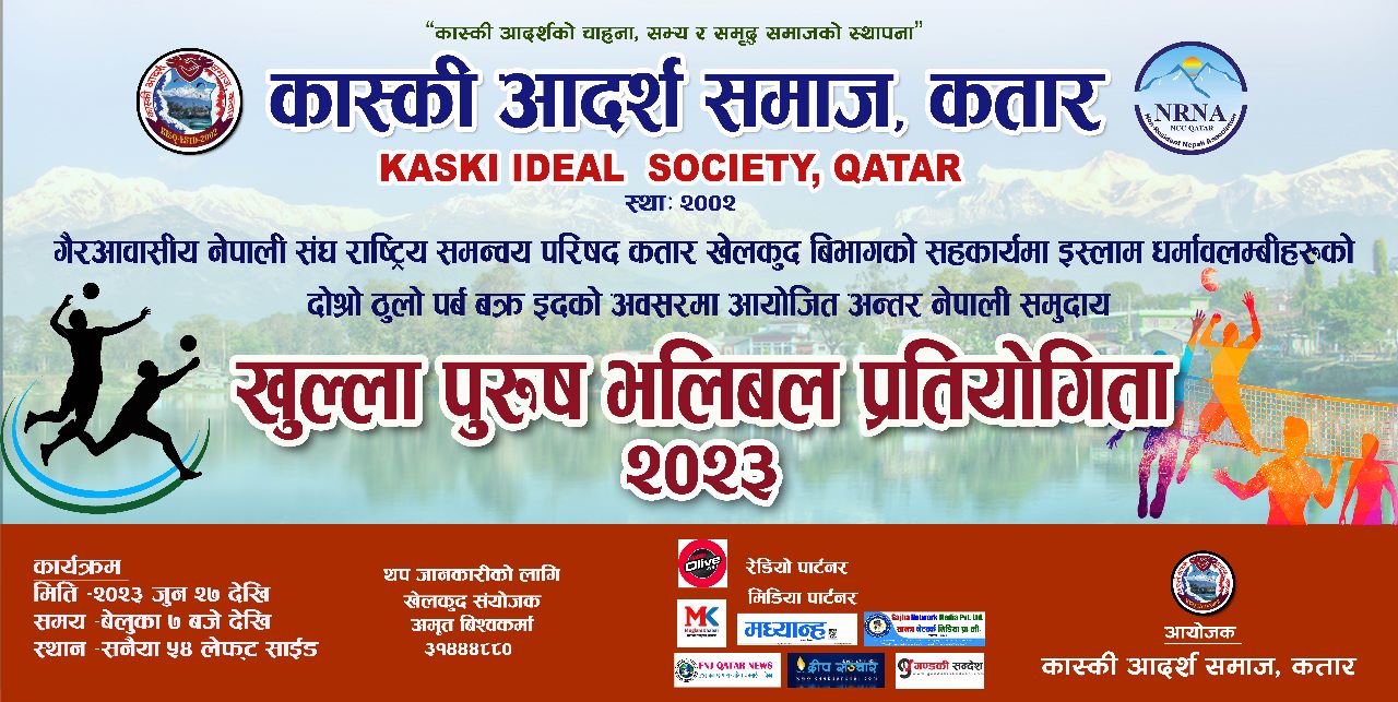 कास्की आदर्श समाज कतारको आयोजनामा तथा गैरआवासिय नेपाली संघ राष्ट्रिय समन्वय परिषद कतारको खेलकुद विभागको सहकार्यमा खुल्ला भलिबल प्रतियोगिता हुने भएको छ ।