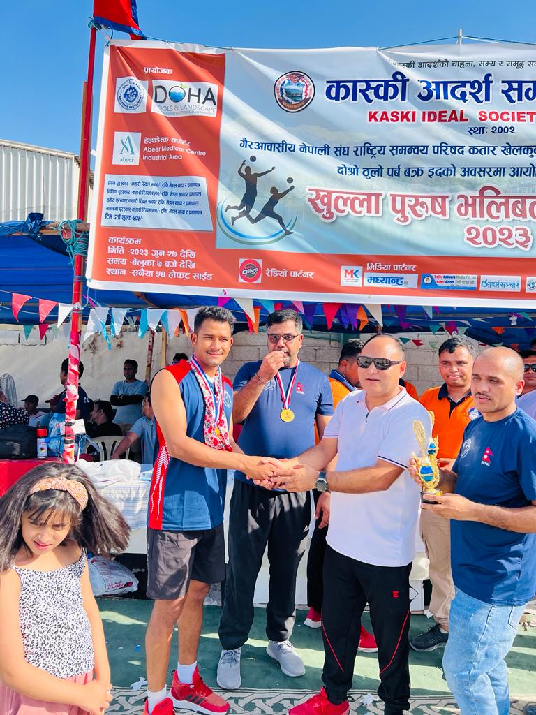 दोहा : कास्की आदर्श समाज कतारकाे आयाेजना साथै गैर आवासिय नेपाली संघ राष्ट्रिय समन्वय परिषद कतार खेलकुद बिभागकाे सहकार्यमा सम्पन्न भएकाे "अन्तर नेपाली समुदाय " खुल्ला पुरुष भलिबल प्रतियोगिता-२०२३ कार्यक्रम सफलता पुर्बक सम्पन्न भएको छ ।
