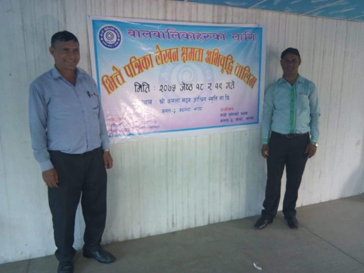 श्री कमला मदनअाश्रित स्मृति मा.वि., क्याम्पामा प्रशिक्षक श्री गिरिराज भट्टराईले २७ जना सहभागी विद्यार्थीहरूलाई भित्ते पत्रिका लेखन सम्बन्धी तालिम र प्रशिक्षक श्री बद्री कार्कीले ३२ जना सहभागी विद्यार्थीहरूलाई नेतृत्व क्षमता अभिवृद्धि तालिम दिइरहनु भएकाे छ ।