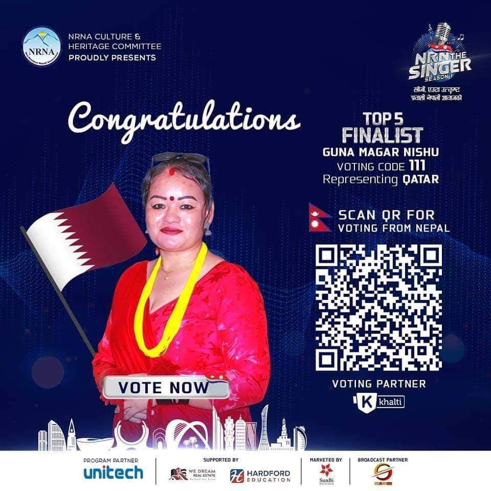 कतार –एनआरएन द सिङ्गर सिजन १ फाइनलको लागि कतारबाट गुना मगर " निशु" काठमाण्डौ प्रस्थान गरेकी छिन ।