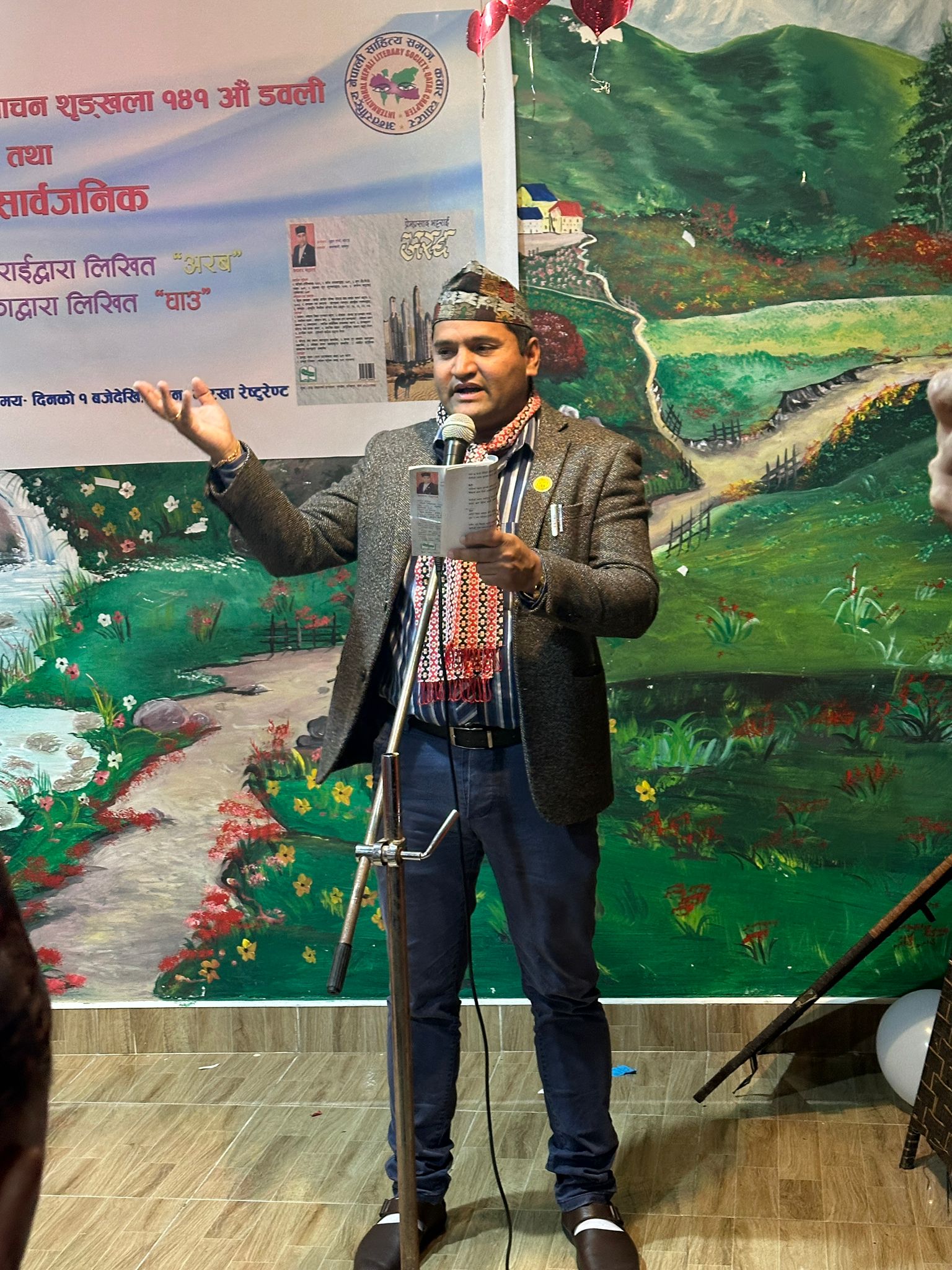 दोहा : गत शुक्रबार ८ डिसेम्बर २०२३ का दिन कतारको नज्मा स्थित गोरखा रेस्टुरेन्टको सभाहलमा अनेसास नवोदित कतारको १४१ औं साहित्यिक रचना वाचन डबलीमा साहित्यकार प्रेम प्रसाद भट्टराईको "अरब" गीतिकाव्य र साहित्यकार बिनोद खड्काको "घाउ" नियात्रा संग्रह सार्वजनिक गरिएको छ ।