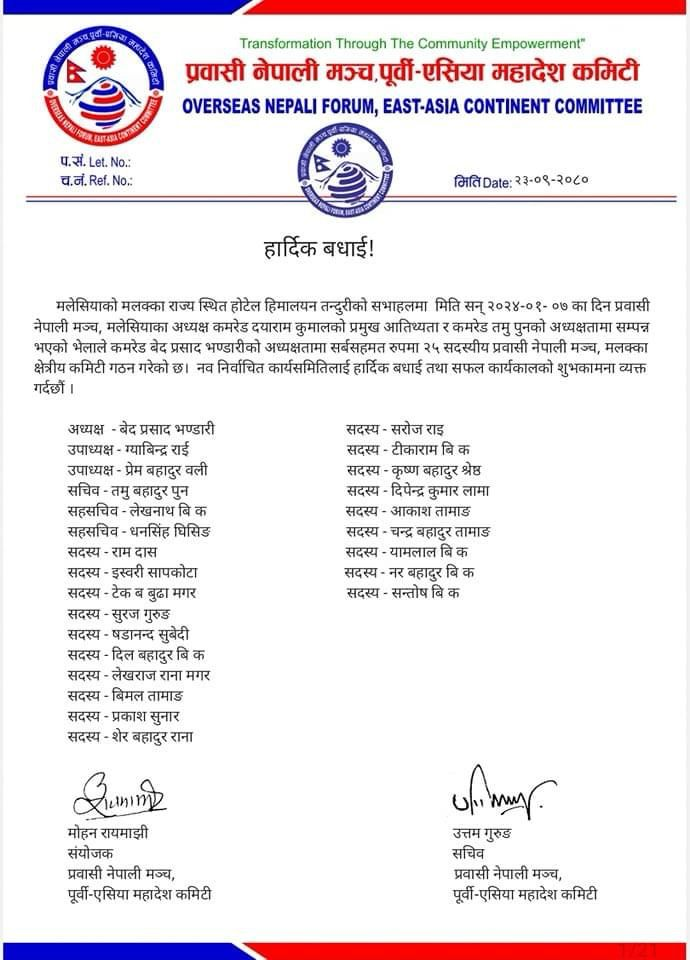 मलेसियाको मलक्का राज्य स्थित होटल हिमालयन तन्दुरीको सभाहलमा सम्पन्न भएको भेलाले वेद प्रसाद भण्डारीको अध्यक्षतामा सर्व सहमत रूपमा २५ सदस्यीय प्रवासी नेपाली मन्च मलक्का क्षेत्रीय कमिटीको गठन गरेको प्रवासी नेपाली मन्च अन्तराष्ट्रिय कमिटी का सचिव तथा प्रचार विभाग प्रमुख चानक पोखरेलले टेलिफोन सम्पर्क मार्फत हामीलाई जानकारी गराएका छन्।