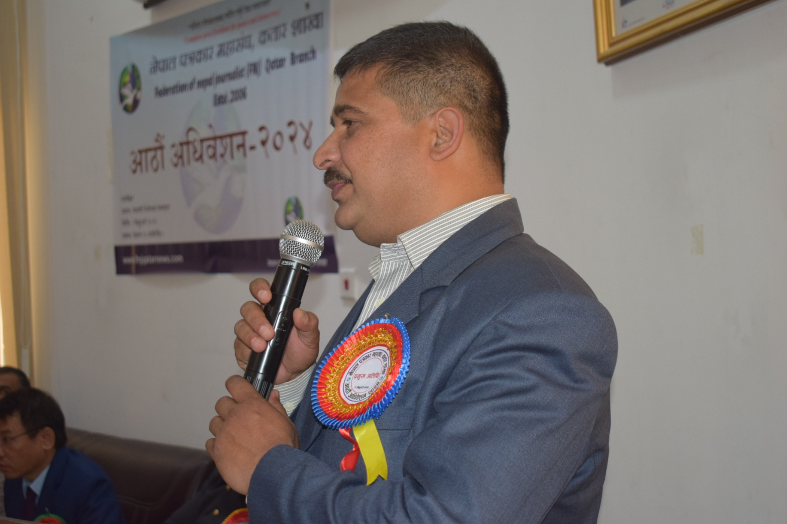 महासंघका केन्द्रिय अध्यक्ष तथा प्रमुख अतिथि बिपुल पोख्रेलले आफ्नो भनाइ राख्दै शाखाको निमन्त्रणामा पुनः कतार आउन पाएकोमा खुशी व्यक्त गर्दै भने, “शाखाको अन्त्यतै ठूलो पर्व मानिने अधिवेशनमा प्रमुख अतिथिको रुपमा सम्बोधन गर्न पाउनु र कतारमा सकृय संचारकर्मी एवं सामाजिक अभियन्ता तथा नेपाली समुदाय संग सात्क्षात्कार हुने अवसर दिएकोमा शाखा परिवारलाई हार्दिक आभार व्यक्त गरे ।
