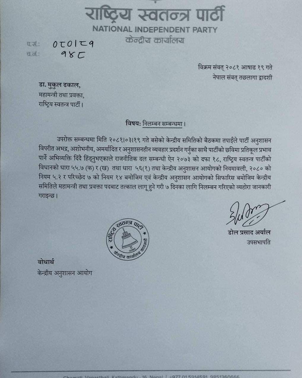 काठमाडौँ, २० असार : राष्ट्रिय स्वतन्त्र पार्टी (रास्वपा)ले पार्टीका महामन्त्री एवं प्रवक्ता डा मुकुल ढकाललाई एक हप्ताका लागि निलम्बन गरेको छ । पार्टीको अनुशासन आयोगको सिफारिसमा उहाँलाई पार्टीको केन्द्रीय समितिले निलम्बन गरेको हो । बुधबार राति अबेरसम्म बसेको पार्टीको केन्द्रीय समितिको बैठकले डा ढकाललाई बैठकमा अमर्यादित र अनुशासनहीन काम व्यवहार गरेको भन्दै कारबाहीका लागि निर्णय गरेको थियो ।