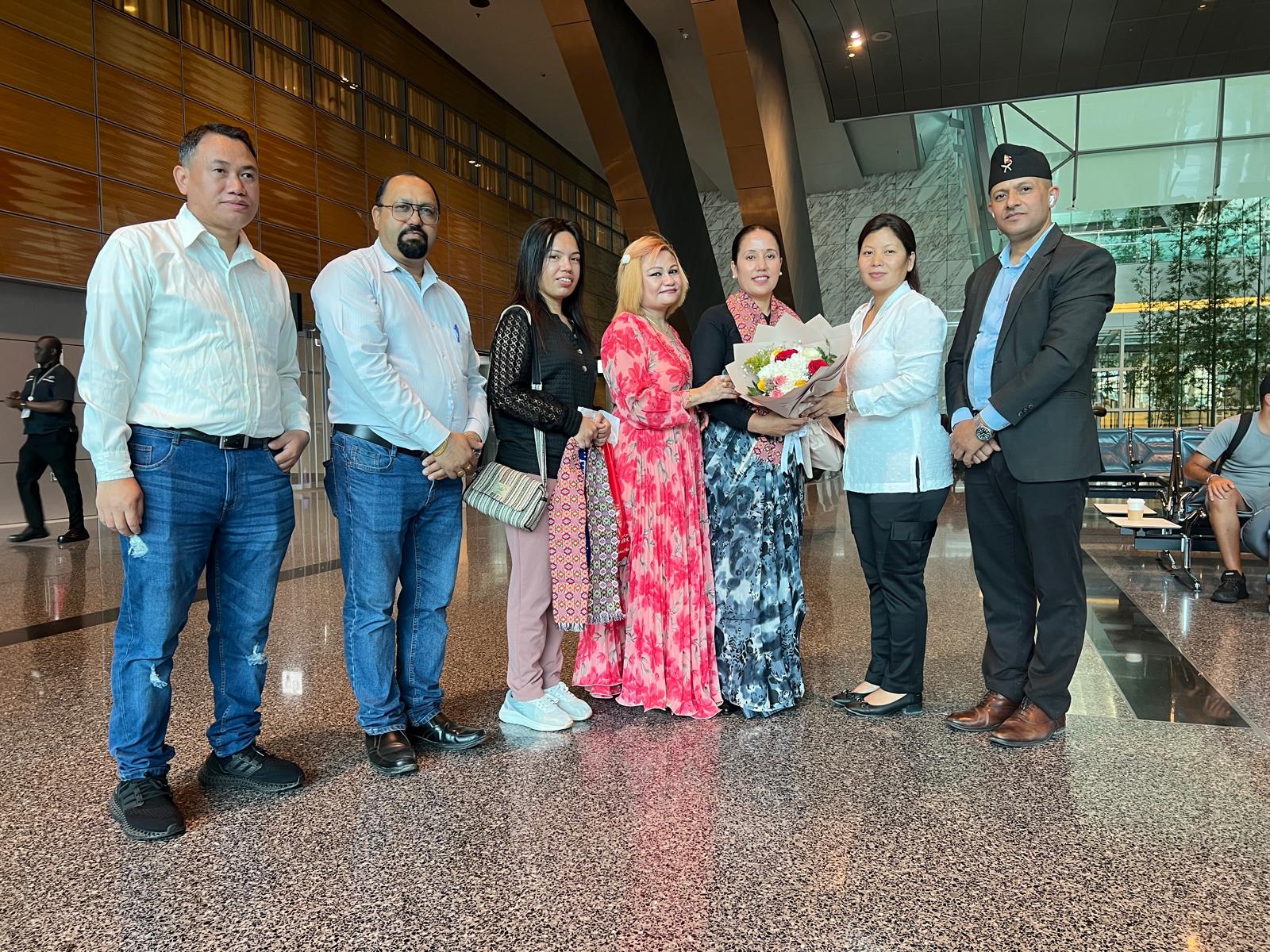 अध्यक्ष मगरलाई स्वागत गर्नको लागि कतारको हमाद अन्तर्राष्ट्रिय बिमानस्थलमा नेपाली महिला समाज कतारकि अध्यक्ष माया केसी, एनआरएनए आइसिसि सदस्य तेज कटुवाल,एनआरएन एनसीसी कतार (महिला बिभाग) संयोजक शुष्मा खतिवडा कटुवाल, लोकदोहोरी प्रतिष्ठान कतार शाखा अध्यक्ष शिवराम ढकाल, लगायत विभिन्न व्याक्तित्व हरुको उपस्थिति रहेको थियो । मगरलाई फुल गुच्छा सहित खादा मालाले स्वागत गरिएको थियो ।