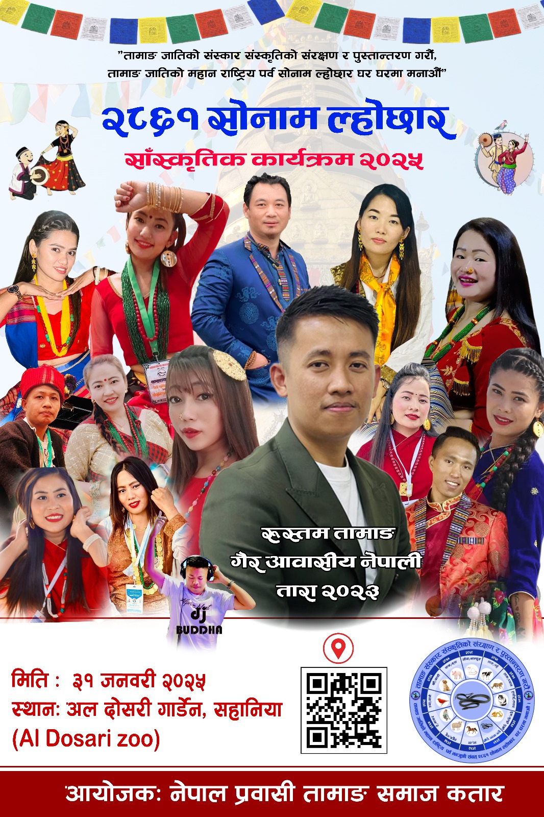 "तामाङ जातिको परिवर्तन,शैक्षिक तथा आर्थिक सुदृढीकरण" भन्ने मुल नाराका साथ सन् २००५ मा स्थापना भएको नेपाल प्रवासी तामाङ समाज कतारले बिगतका बर्षहरुमा झैं यस बर्ष पनि "तामाङहरुको महान चाड राष्ट्रिय पर्व मञ्जुश्री सम्बत २८६१ सोनाम ल्होछार ३१ जनवरी २०२५ शुक्रबारका दिन, अल दोसरी गार्डेन,सहानिया भब्यताका साथ मनाउन लागेको समाजका अध्यक्ष शुबास तामाङले जानकारी गराए ।