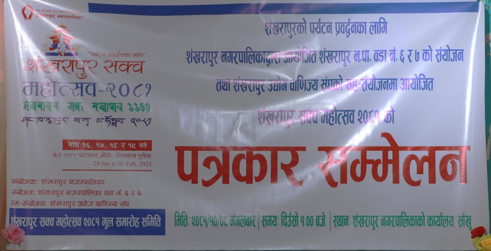 शंखरापुर नगरपालिकाको आयोजना तथा वडा नं ६ र ७ को संयोजनमा यहि आउँदो माघ १६ गते देखी १९ गते सम्म ४ दिन भब्य महोत्सव हुन लागेको आज साँखु स्थित समरा गार्डेन बैङ्क्वीट्को सभाहलमा आयोजित पत्रकार सम्मेलनबाट नगर प्रमुख तथा महोत्सव मुल समारोह समितिका संयोजक रमेश नापितले जानकारी दिएका छन।