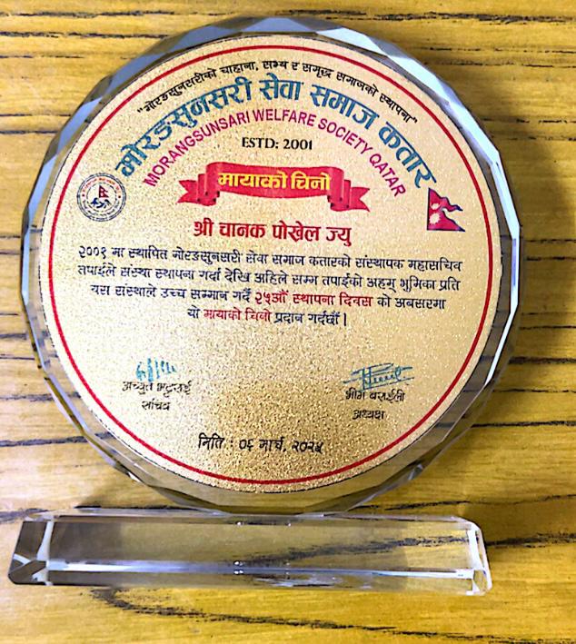 "२००१ मा स्थापित मोरङसुनसरी सेवा समाज कतारको संस्थापक महासचिव, संस्था स्थापना गर्दा देखि अहिले सम्म अहम् भूमिका प्रत्ति यस संस्थाले उच्च सम्मान गर्दै २५औं स्थापना दिवस को अबसरमा मायाको चिनो सहित सम्मान गरिएको जनाइएको छ ।