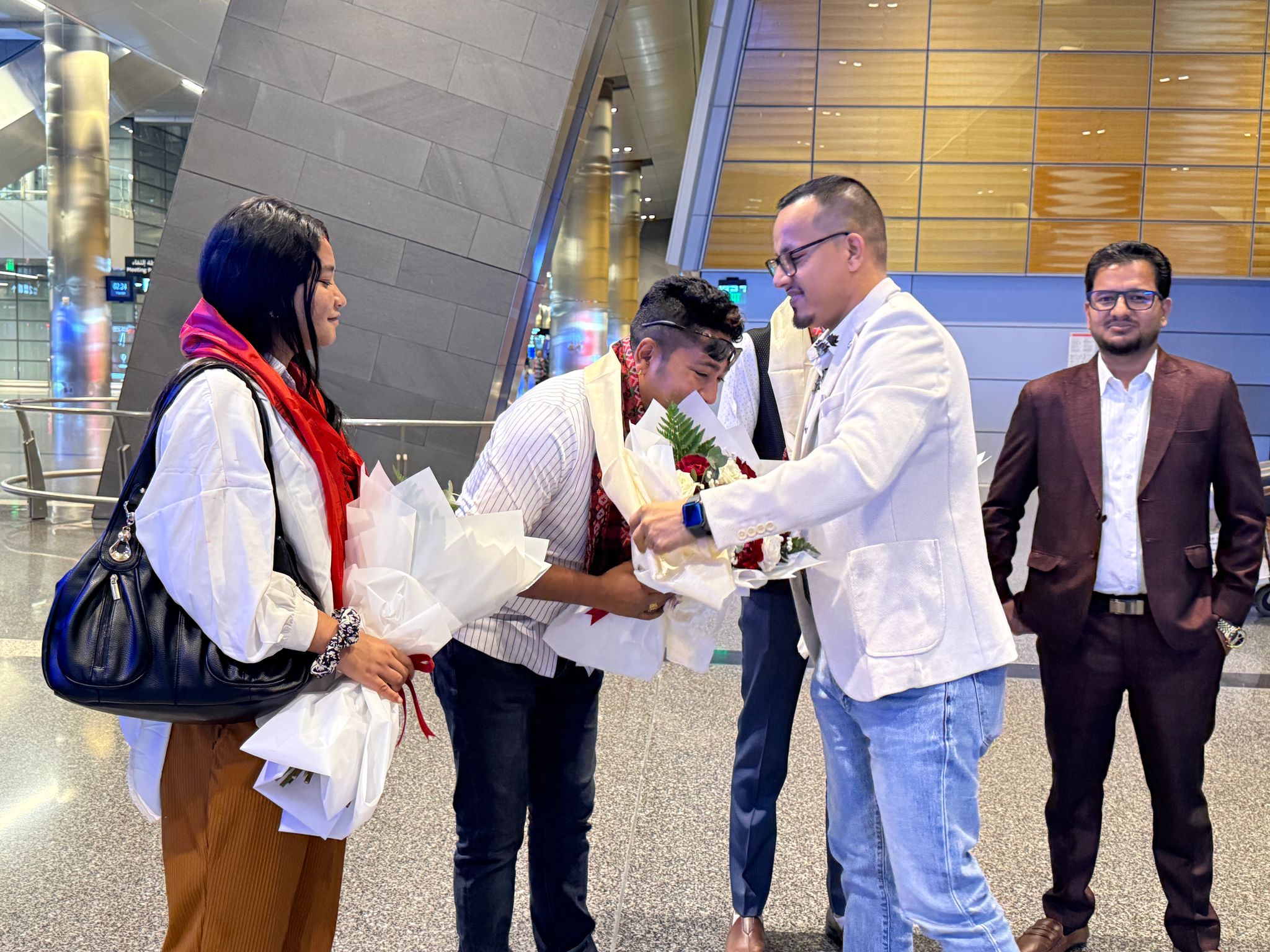 कलाकार द्वयलाई स्वागत गर्नको लागि समाजका अध्यक्ष निराजन गौतम,प्रमुख सल्लाहकार तथा अक्षयकोष तदर्थ समितिका संयोजक सन्तोष पौडेल,टेक रसाइली,हेम सुबेदी लगायतका व्यक्तित्वहरु कतारको हमादअन्तर्राष्ट्रिय बिमानस्थलमा पुगेका थिए ।