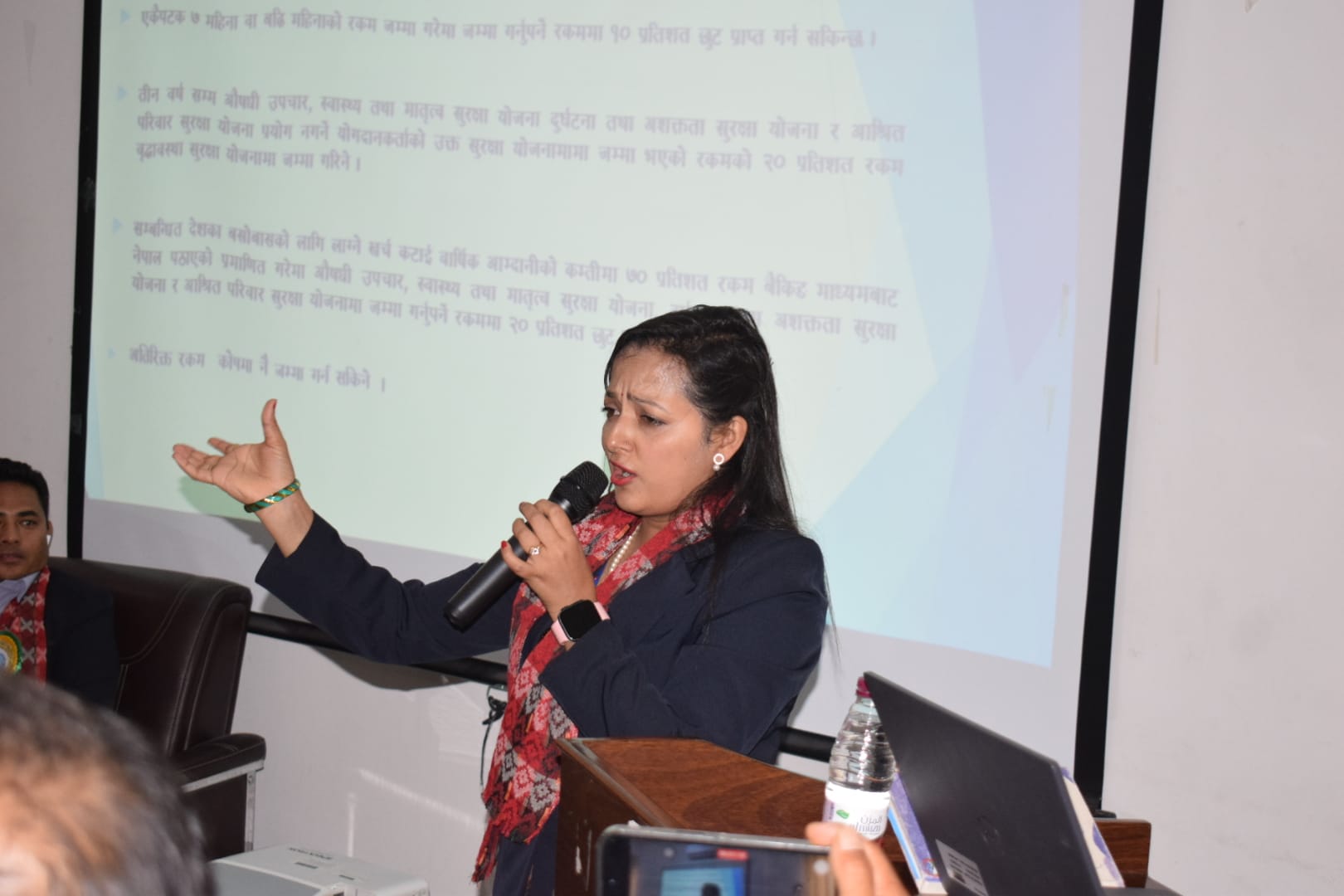 कार्यक्रममा प्रमुख वक्ताको रुपमा आमन्त्रित अतिथि, सामाजिक सुरक्षा कोष नेपालकी वरिष्ठ सहायक निर्देशक शुसिला पौडेलले सामाजिक सुरक्षा कोषको महत्व, कोषमा आवद्ध हुने तरिका, पासवर्ड परिवर्तन, KYC अद्यावधिक, दाबी प्रक्रिया र पुन: श्रम स्वीकृति जस्ता महत्वपूर्ण विषयहरूमा करिव एक घन्टा बढी प्रशिक्षण दिइन ।