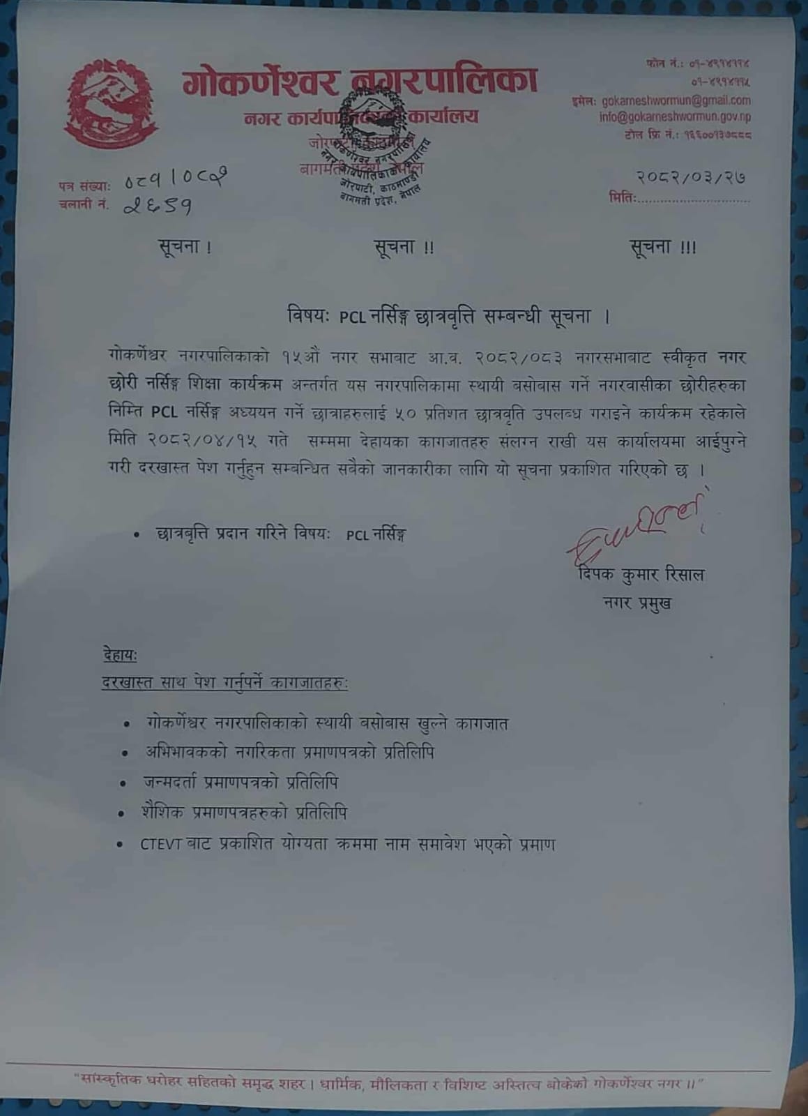 छात्रवृत्ति प्राप्त गर्न आवस्यक कागजात सहित यहि १५ गते भित्र नगरपालिकामा आइपुग्ने गरि दरखास्त पठाउन आग्रह गरेका छन।नेपालीमा एउटा उखान छ, 'कोहि नहुनेको दैव हुन्छ' यहि नेपाली उखानलाई चरितार्थ गर्दै नगर प्रमुख दिपक रिसालले पिसिएल नर्सिङ पढ्ने स्थानिय बासिन्दा छोरीहरूका लागि एउटा असल अभिभावक बनेर उदाएका छन।नगरबासीको शिक्षा र स्वास्थ्यलाई बिशेष महत्वका साथ उत्कृष्ट कार्य गर्दै आएका नगर प्रमुख रिसालले ५०% छात्रवृत्ति दिई छोरीहरुलाई सक्षम र क्षमतावान आत्मनिर्भर बनाउनुका साथै स्वास्थ्य क्षेत्रका उत्कृष्ट जनशक्ति निर्माण गर्न उक्त कार्यक्रम ल्याएका छन् ।अब नगरपालिका भित्रका कुनै पनि छोरीहरु आर्थिक अभावकै कारणले पिसिएल नर्सिङ पढ्न बाट बन्चित नहौउन,जुन सुकै जात धर्म र बर्गका छोरीहरु PCl नर्सिङ पढ्न सकुन भन्ने उदेश्यले उक्त कार्यक्रमको घोषणा गरेको हुन। मेयर रिसालले यसलाई सार्थक बनाउन नगरपालिकाको १५ औं नगरसभा तथा आर्थिक वर्ष २०८२/८३ को नीति तथा कार्यक्रम अन्तर्गत स्वीकृत 'नगर छोरी नर्सिङ कार्यक्रम` मार्फत सुनिश्चित गरेका छन।