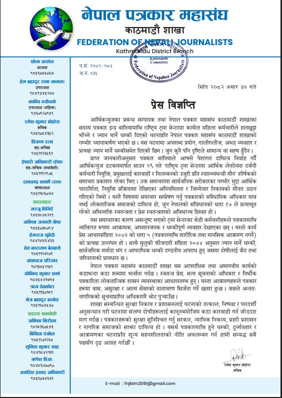 काठमाडौं शाखाका सचिव रमेश कुमार बोहोराले पत्रकारमाथि भएको आपराधिक तथा अमानवीय आक्रमणको घोर भर्त्सना गर्दै सम्बन्धित सुरक्षा निकाय र प्रशासनलाई तत्काल, निष्पक्ष र पारदर्शी अनुसन्धान गरी दोषीलाई कानूनबमोजिम कडाभन्दा कडा कारबाही गर्न जोडदार माग गरेको छ ।