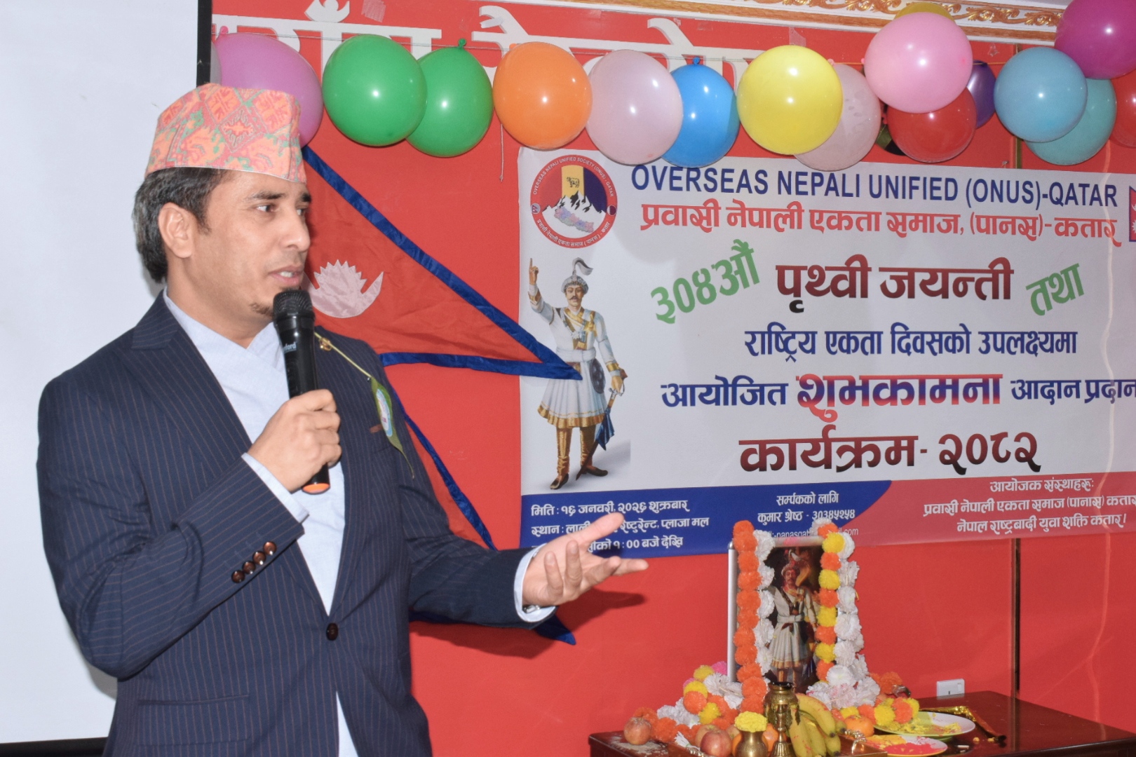 नेपालका राष्ट्रनिर्माता श्री ५ बडामहाराजाधिराज पृथ्वीनारायण शाहको ३०४ औँ जन्मजयन्ती तथा राष्ट्रिय एकता दिवस २०८२ को अवसरमा कतारमा विशेष कार्यक्रम सम्पन्न भएको छ। प्रवासी नेपाली एकता समाज (पानस) कतार र नेपाल राष्ट्रवादी युवा शक्ति कतारको संयुक्त आयोजनामा यो कार्यक्रम भव्यताका साथ सम्पन्न गरिएको हो।