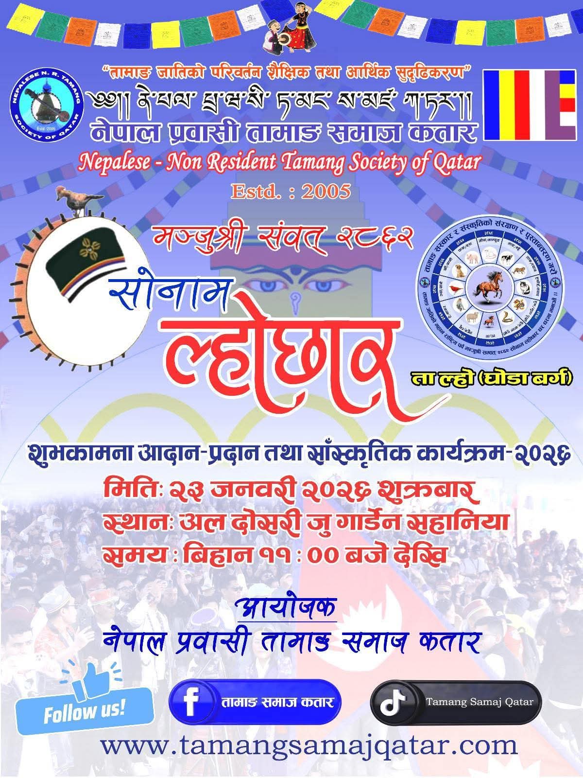 "तामाङ संस्कार र संस्कृतिको संरक्षण र पुस्तान्तरण गरौँ" भन्ने सन्देशसहित आगामी २३ जनवरी २०२६ (शुक्रबार) का दिन कतारको अल दोसरी, जु–सहानिया मा बिहान ११:०० बजेदेखि यो उत्सव मनाइनेछ।