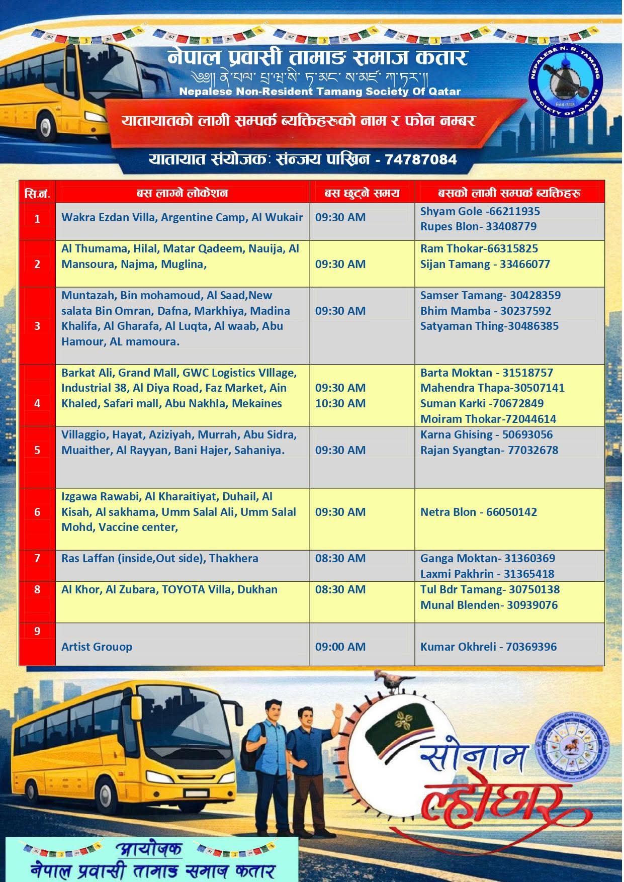 आयोजकले दोहा कतारको हरेक कुनाबाट सहभागीहरूका लागि नि:शुल्क यातायातको व्यवस्था गरेको छ। थप जानकारीका लागि यातायात संयोजक संन्जय पाख्रिन - 74787084 मा या तल ब्यानरमा उल्लेखित नम्बरमा सम्पर्क गर्न सकिनेछ।
