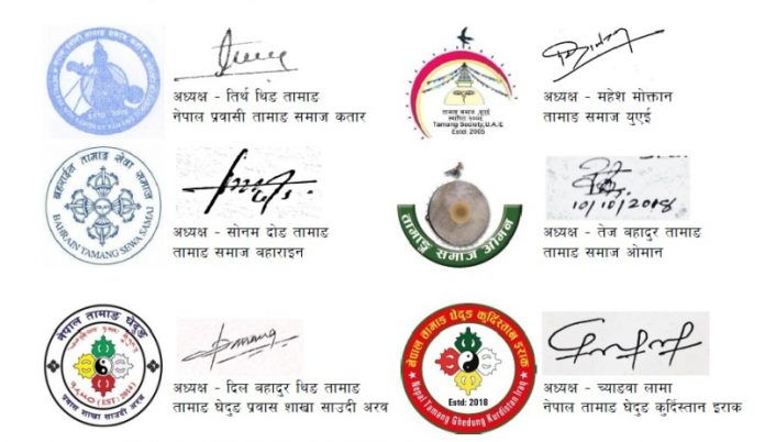उक्त प्रेस विज्ञप्तिमा नेपाल प्रवासी तामाङ समाज कतारका अध्यक्ष तिर्थ थिङ तामाङ,तामाङ समाज युएईका अध्यक्ष महेश मोक्तान, तामाङ समाज बहाराइनका अध्यक्ष सोनाम दोङ तामाङ, तामाङ समाज ओमानका अध्यक्ष तेज बहादुर तामाङ, तामाङ घेदुङ प्रवास शाखा साउदीका अध्यक्ष दिल बहादुर थिङ तामाङ र नेपाल तामाङ घेदुङ कुर्दिस्तान इराकका अध्यक्ष च्याङबा लामाको सयुक्त हस्तक्षरसहित प्रेसविज्ञप्ति जारी गरेका हुन् ।