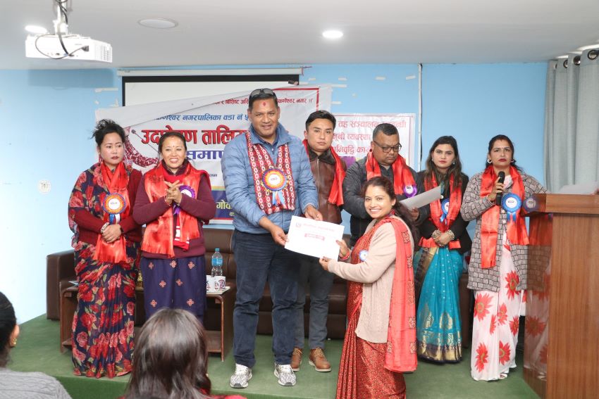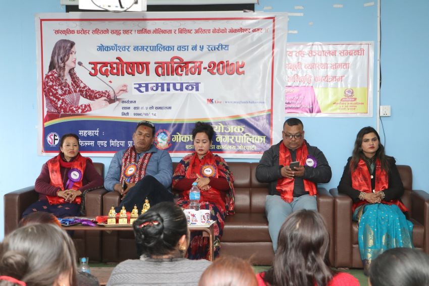 काठमाडौ, गोकर्णेश्वर नगरपालिकाको वडा नं ५ मा वडा स्तरिय सात दिने उद्घोषण तालिम आज सम्पन्न भएको छ।सन्ध्या फिल्म्स एन्ड मिडिया प्रालीका अध्यक्ष दिलमाया तामाङको सभापतित्वमा शुरु भएको समापन कार्यक्रममा गोकर्णेश्वरनगरपालिका वडा नं ५ का वडा अध्यक्ष तथा नगर प्रवक्ता नारायण बहादुर सुवेदी प्रमुख अतिथी रहेका थिय।त्यसैगरी बिशेष अतिथिहरुमा वडा सदस्यहरु कमला नेपाली,धर्म थिङ लामा,श्री बहादुर योगी, दुर्गा राना मगर, वडा सचीव लगायत दर्जनौ प्रशिक्षार्थीहरुको उपस्थिति रहेको थियो।